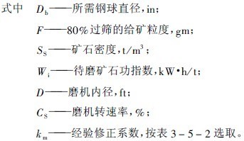 式(5-2)不能直接使用,必須針對特定礦石作兩組試驗(yàn),列出兩個(gè)方程式成一組,從方程組求解出i及n才能得出特定的球徑方程式,方可應(yīng)用。為了方便應(yīng)用,K.A拉蘇莫夫提出,對中硬礦石可以直接使用下面的簡便計(jì)算式計(jì)算Db(mm)。