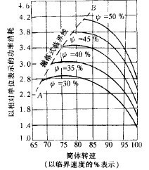 B為球徑,mm。由公式(5-40)和&5=Ss值看出,每噸大球的輸入功率比小球的大。筆者的工業(yè)試驗(yàn)證實(shí),球徑減小后磨機(jī)功率可下降2%-3%。