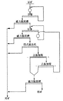 目前,我國有一些選礦廠應用強磁場磁選機直接選別赤鐵礦或假像赤鐵礦,實踐證明,這是一種較好的有效方法。例如某選礦廠處理含磁鐵礦和赤鐵礦的礦石,應用弱磁場磁選機和強磁場磁選機分別回收磁鐵礦和赤鐵礦。其工業試驗流程如圖1所示。采用該流程達到的指標是:原礦品位34.20%(Fe2O3.7%)時,精礦品位達56.46%Fe,回收率78.95%。