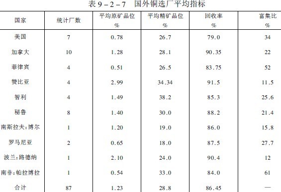 (2)國內(nèi)銅選礦現(xiàn)狀我國現(xiàn)有32座大中型銅選廠,年產(chǎn)方噸以上精礦含銅量的有銅錄山、德興、白銀、易門、落雪等選廠。口處理量在3000噸以上的有13座,500-3000噸的有15座。礦石入選品位平均為0.94%,雖然原礦品位逐年下降,但銅精礦品位則隨著選礦工藝的發(fā)展和技術(shù)進步而逐年提高,如表9-2-8所列。