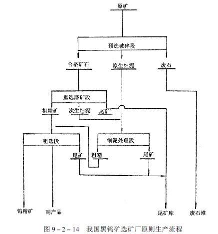 綜上所述,我國黑鎢礦選礦的原則流程是,原礦粗碎后分級預先富集,拋棄大量粗塊廢石;合格礦破碎篩分,經三級跳汰,加強粗粒早收;跳汰尾礦磨礦分級,實行多級搖床分選,丟棄尾礦,中礦再磨再選:細泥集中濃縮,單獨處理;重選粗精曠采用多種方法聯合精選,既提高鎢精礦品位,又綜合回收副產。圖9-2-14為我國黑鎢選礦原則生產流程。