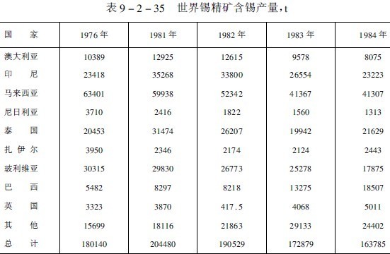 1976年以來,世界錫精礦含錫和精錫的產量列于表9-2-35和表9-2-36(不包括我國、蘇聯和東歐各國)。