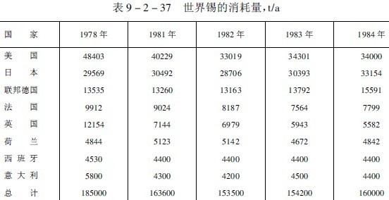 世界錫的消耗量列于表9-2-37。