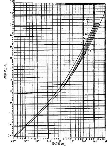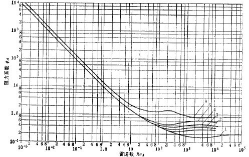 公式(4-3)稱為介質阻力通式,但由公式(4-4)先求出值,才能解出R。里萊(L.Rayleigh)用試驗法作出的=(Re)由線如圖3-4-1所示。用此曲線,先按公式(4-5)算出Re值,再在圖上找到與其對應的值,代入公式(4-3)中,就可求出介質阻力R。