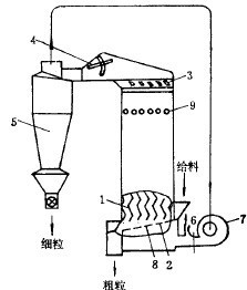 上述這些設備,被氣流帶走的細粒產物,除另有處理方法外,還需設置集塵器來收集。圖3-4-6所示的上升氣流風力分級機(附旋風集塵器),呈方形的分級室內,裝有若干近于平行的豎直“之”字形導板1。從料斗給到篩板2上的物料,在下部供入的上升氣流作用下,被帶到分級室中,經過彎曲的導板上行過程中,粗的礦粒落下與未過篩的粗粒一起排出,為粗粒產物。細的礦粒經上部通道入旋風集塵器分離,得細粒產物。集塵器上部排出的氣流,又回到風機,循環使用,或者從孔6中排走。