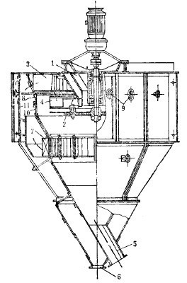 另一種結構近于水力旋流器的風力旋流器,為提高分級效率,下部還供入上升氣流。通過式離心分級器(見圖3-4-8),主要用于與干式磨機閉路工作。設備主要由外錐1和內錐2組成,上部裝有導向葉片5,使由內外錐之間上來的氣流呈切線進入內錐。磨機產物與氣流一起從底部管道中以大約18-20米/秒的速度向上供入,進入內外錐之間的環形空間后,因過流斷面變大,速度降到4-6米/秒,于是,粗的礦粒落下,由管4中排出,返回磨機再磨。其他礦粒被氣流帶著往上行,經葉片5,呈切線進入內錐,產生回旋運動。在慣性離心力作用下,較粗的礦粒被拋到內錐壁上,然后下落,由排礦管6排出。這種產物或作為產品,或者返回磨機,視情況而定。細礦粒隨氣流從頂部管道中排出,集塵器中收集,為細粒產物。